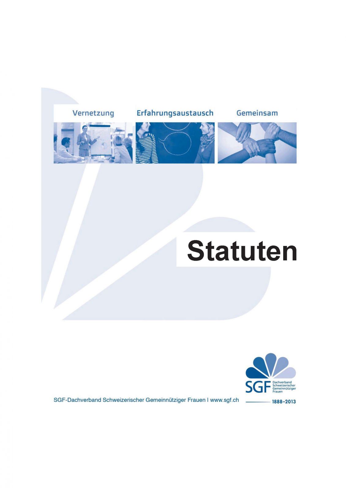 Die SGF-Statuten sind auf der Website www.sgf.ch unter «über uns» aufgeschaltet. SGF-Merkblätter wie „Neue Vorstandsmitglieder finden“, „Pflichten des Vorstands“, „Produktehaftpflicht (Brockenstuben)“, Musterstatuten und das Mitgliederverzeichnis sowie weitere Dokumente sind zur Unterstützung der Vereinsarbeit im Mitglieder-bereich auf der Homepage veröffentlicht.